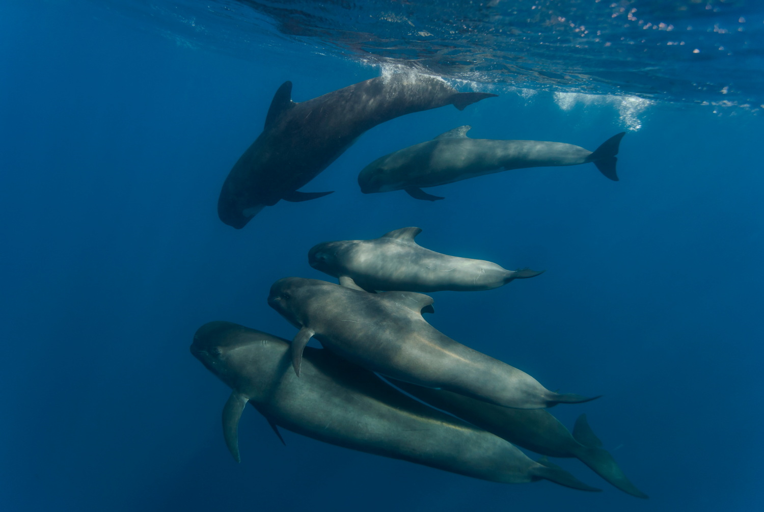 Size: it exhibits considerable sexual dimorphism. Males reach 6 meters and exceed 2 tonnes; females, smaller, reach 5 meters and 1 tonne. Its elongated body and globular head make it unmistakable. The rostrum is very small and the dorsal fin is in a mid-forward position, characterised by a base greater than its height, with a very concave posterior margin and a rounded, curved tip. The pectoral fins are long and slender, sickle-shaped, and the caudal peduncle is very convex and narrow laterally. It is ebony black in colour, while the young at birth are much lighter. Adults have a characteristic greyish-white spot on the chest and belly, in the shape of an anchor: the ‘marres’ (the appendages of the anchor) widen symmetrically under the chin and the spindle continues across the belly until it fades into the genital area. Dives can last 10-15 minutes and its breath exceeds one metre in height.